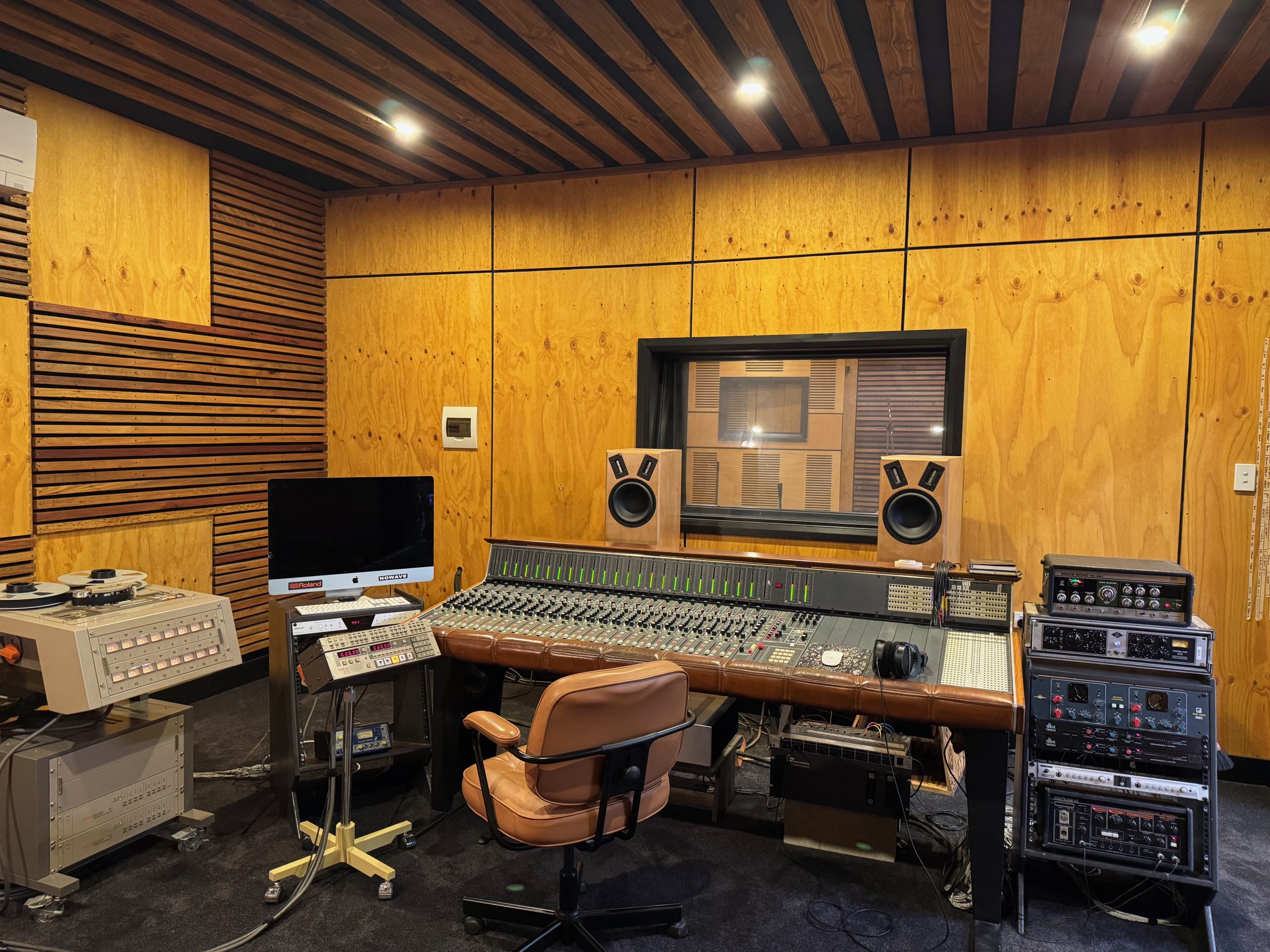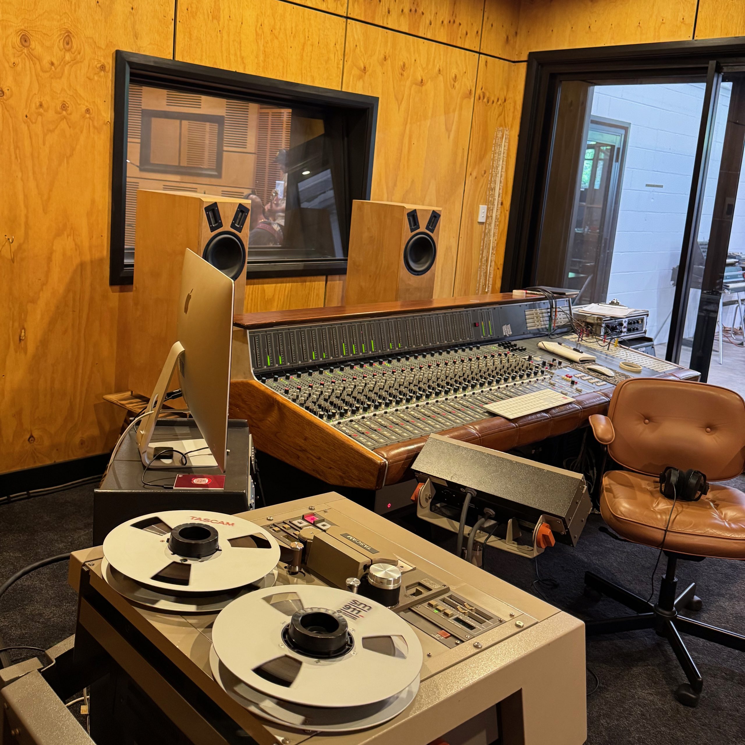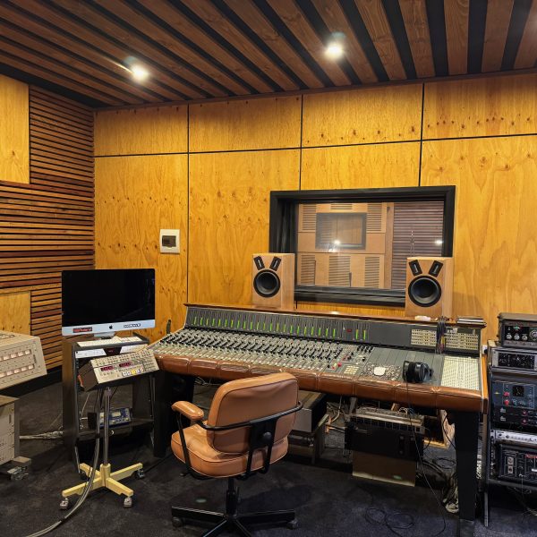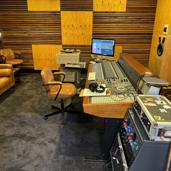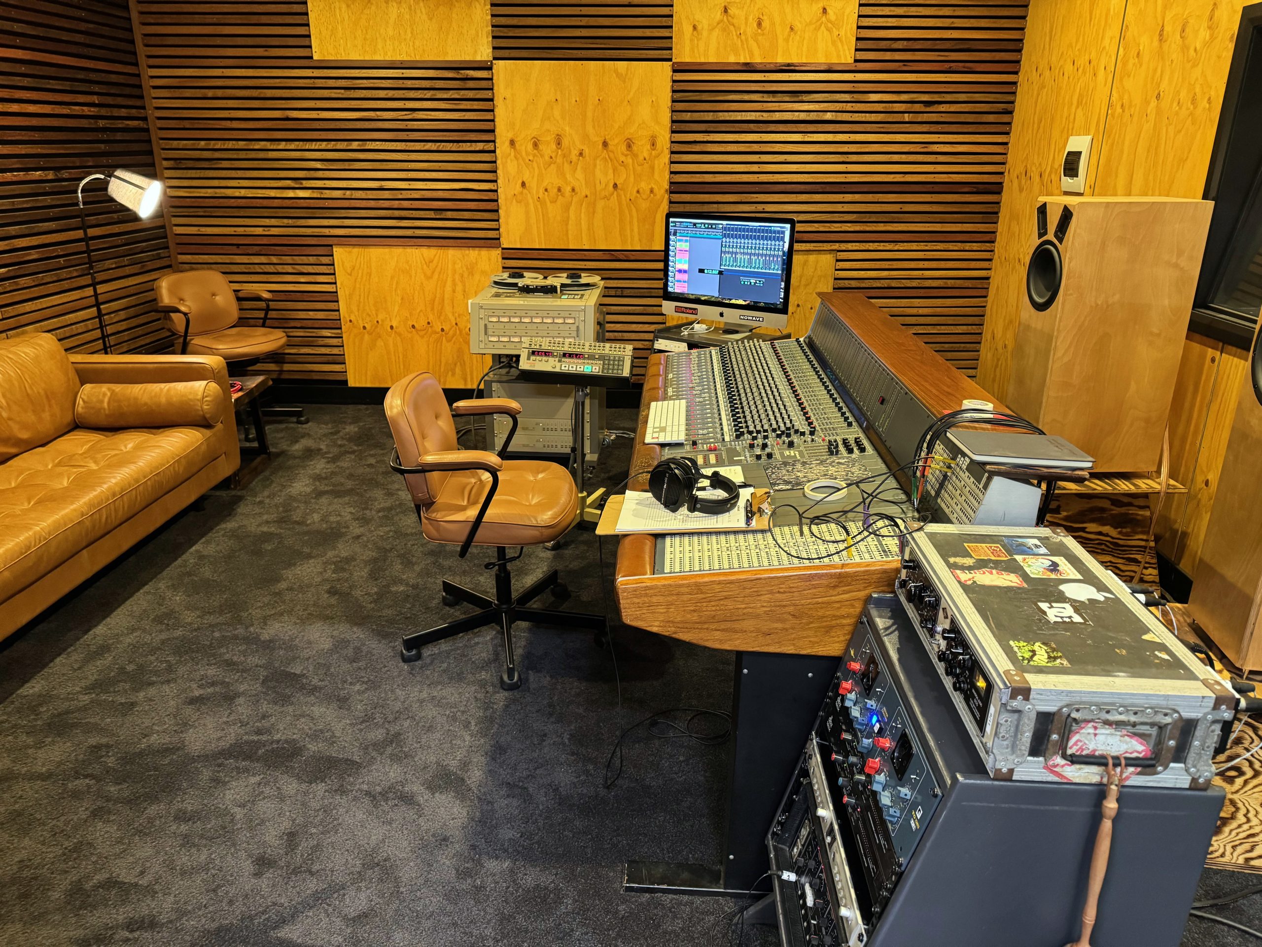 Control Room – designed with unparalleled angled walls, acoustically built to achieve perfect sounding mixes and recordings. Features the 1979 David Bowie Console and custom made hand-built Harris Audio Speakers and Amplifier.